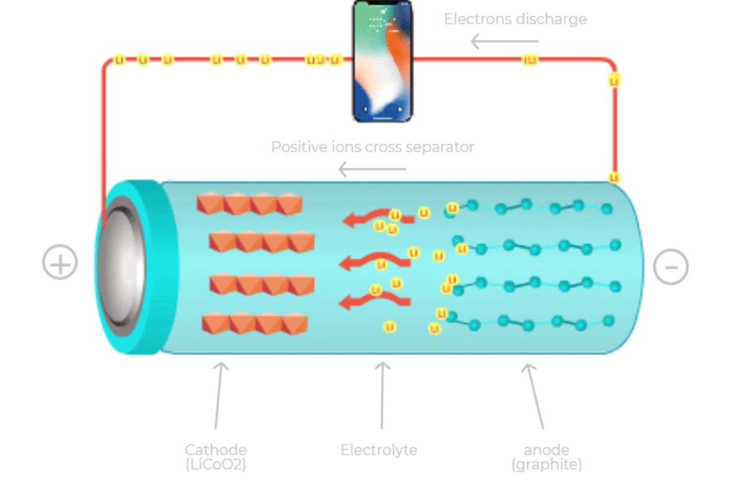 At the same time, positively charged ions flow from the anode to the cathode via the separator. When batteries are charged, this process is reversed.In Lithium-ion batteries, the cathode is made of Lithium cobalt oxide (LiCoO2) and the anode is made up of graphite (carbon).